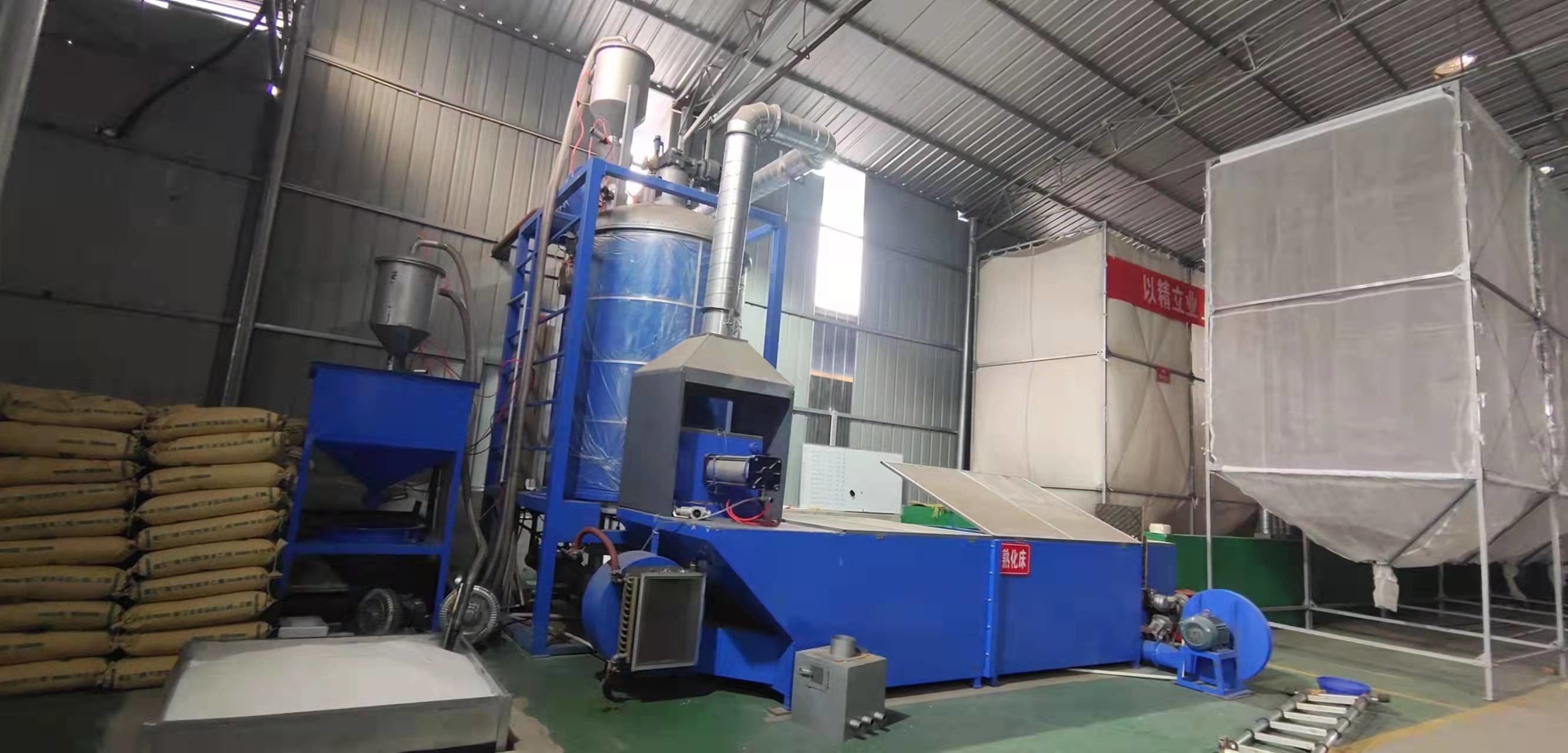 ■ Die kontinuierliche Vor-Expansionsmaschine umfaßt die Hauptexpansionsmaschine, einen Schraubförderer, einen Flüssigkeitsbetttrockner, einen Bläser, um das ausgeweitete Material in die Silos zu transportieren.