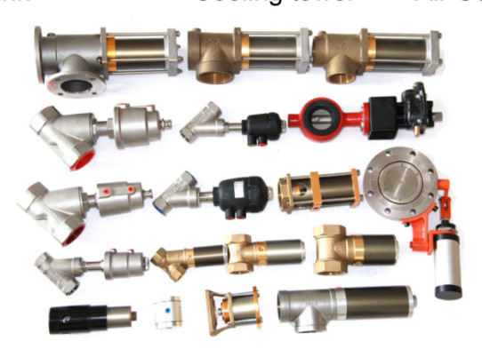 Hydraulische und pneumatische Teile: Ventile, Aktoren und Schläuche.